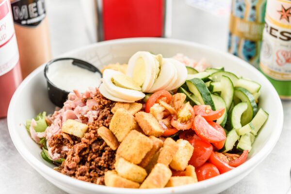 Mixed greens, ham, turkey, bacon, cheddar cheese, hard-boiled egg, cucumbers, cherry tomatoes, and croutons w/ Miss Fancy’s ranch
